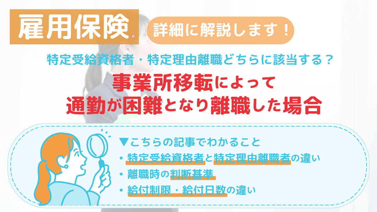 その中でも、『事業所の移転によって通勤が困難となり離職した場合』は、特定受給資格者なのか、特定理由離職者なのか、それぞれ該当する場合について説明します。